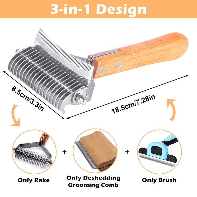 - 3-in-1 Functionality: Combines a dematting rake, smoothing brush, and shedding comb for a complete grooming experience.