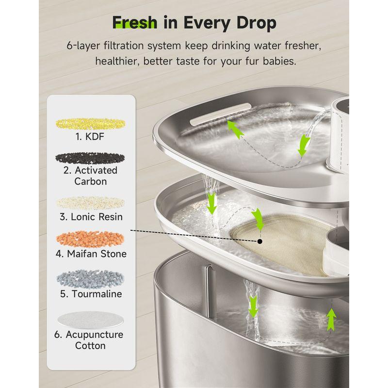 Our water fountain is not just a drinking accessory but a health essential for your pets. The freedom to place the fountain anywhere without worrying about cords makes it perfect for any space, while the large tank means less refilling for you. Stainless steel material prevents bacteria buildup and is a cinch to maintain, ensuring your pets always have access to clean water. Additionally, the silent operation and intelligent sensor modes make it an advanced hydration solution that adapts to both your lifestyle and your pet’s needs.