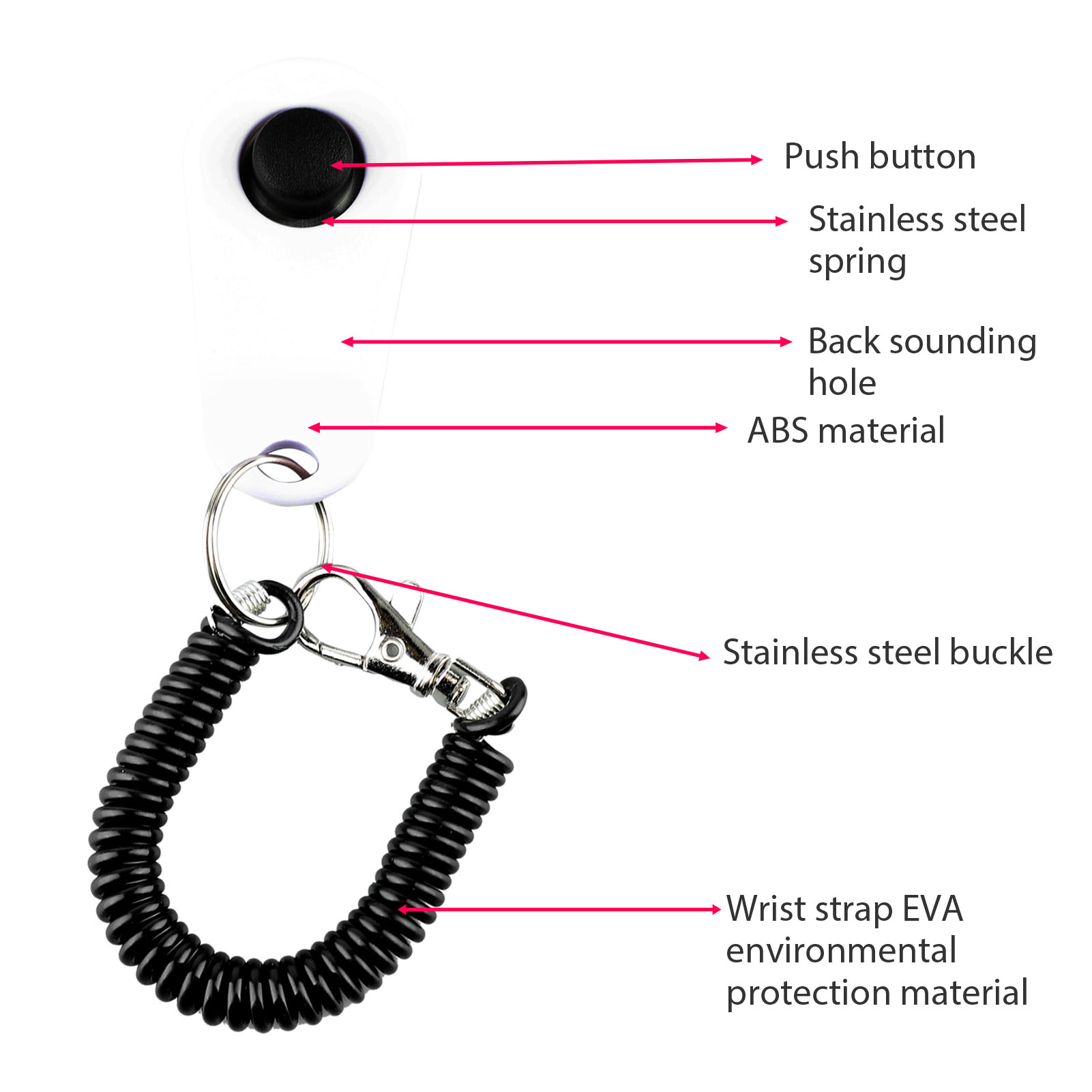 - Comfortable Wrist Strap: Equipped with a high-elasticity wrist strap and a stainless steel hook, this clicker is easy to carry and always within reach.