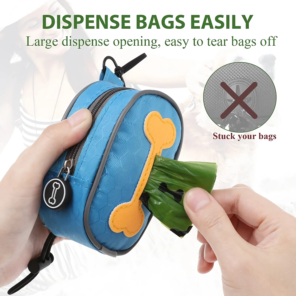 This poop bag dispenser doesn’t just hold poop bags; it’s designed to accommodate 1-2 rolls of bags (not included) along with other essentials like keys and treats. The durable, wear-resistant, and waterproof Oxford fabric guarantees long-lasting use and ensures that your essentials stay protected and secure. The holder also features a handy tie-off option for used bags, freeing your hands for more important tasks.