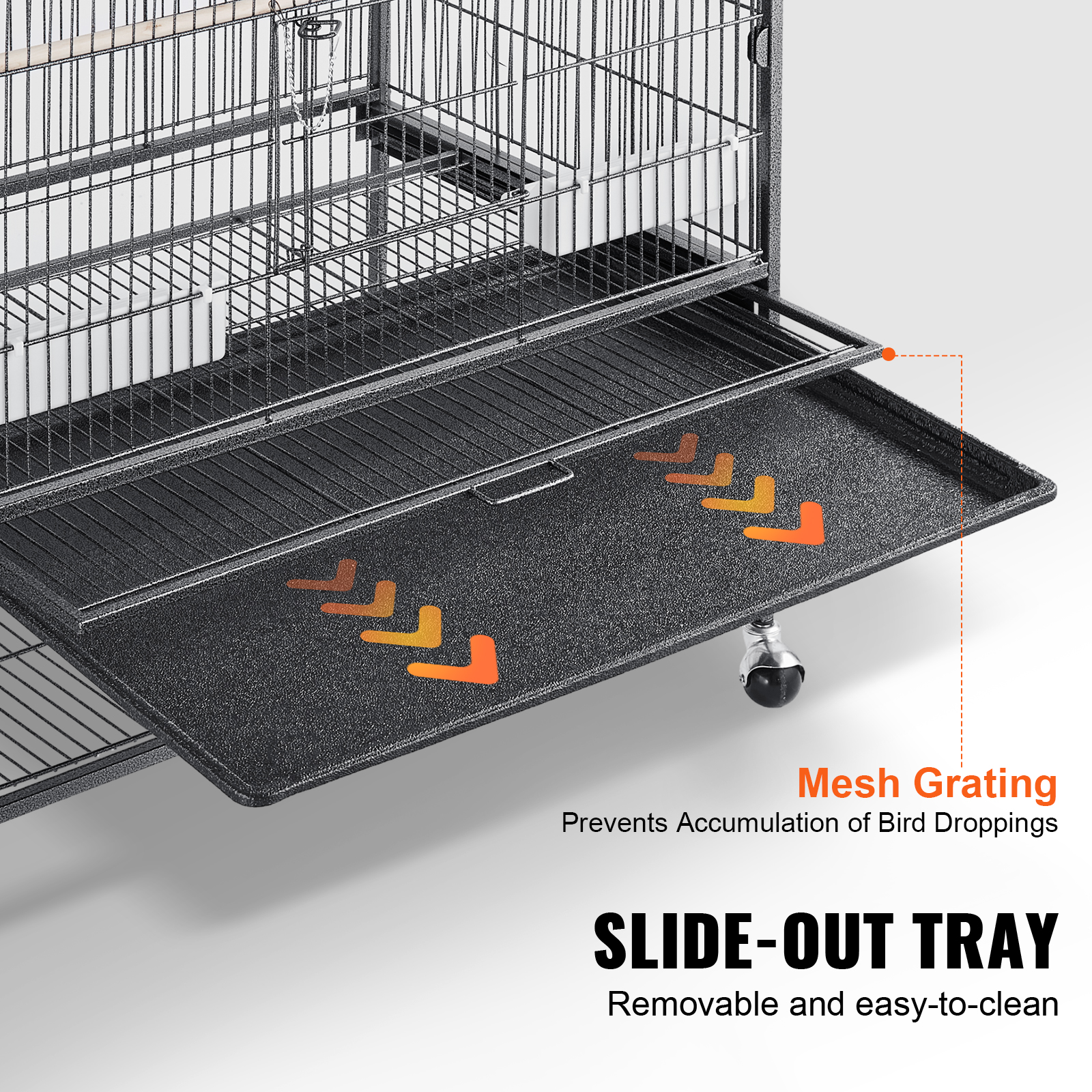 - Easy Maintenance: The removable slide-out tray with waterproof coating simplifies cleaning. The mesh grating prevents direct contact with waste, maintaining a fresh and hygienic environment for your birds.