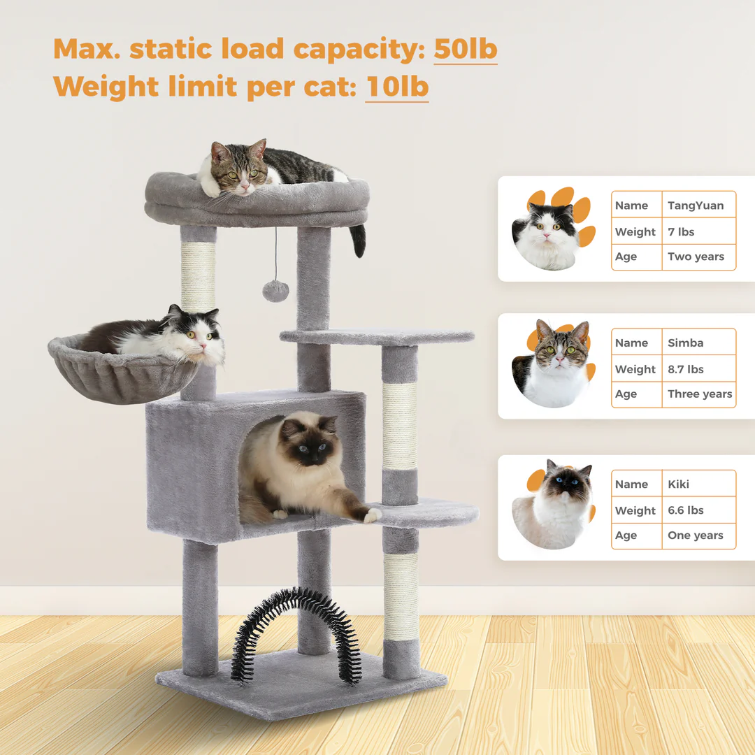 - All-in-One Playground: This cat tree features a large top perch, a cozy hammock, a sisal-wrapped scratching post, a self-grooming brush, and a fun hanging ball toy, offering endless entertainment and relaxation options for your feline friend.